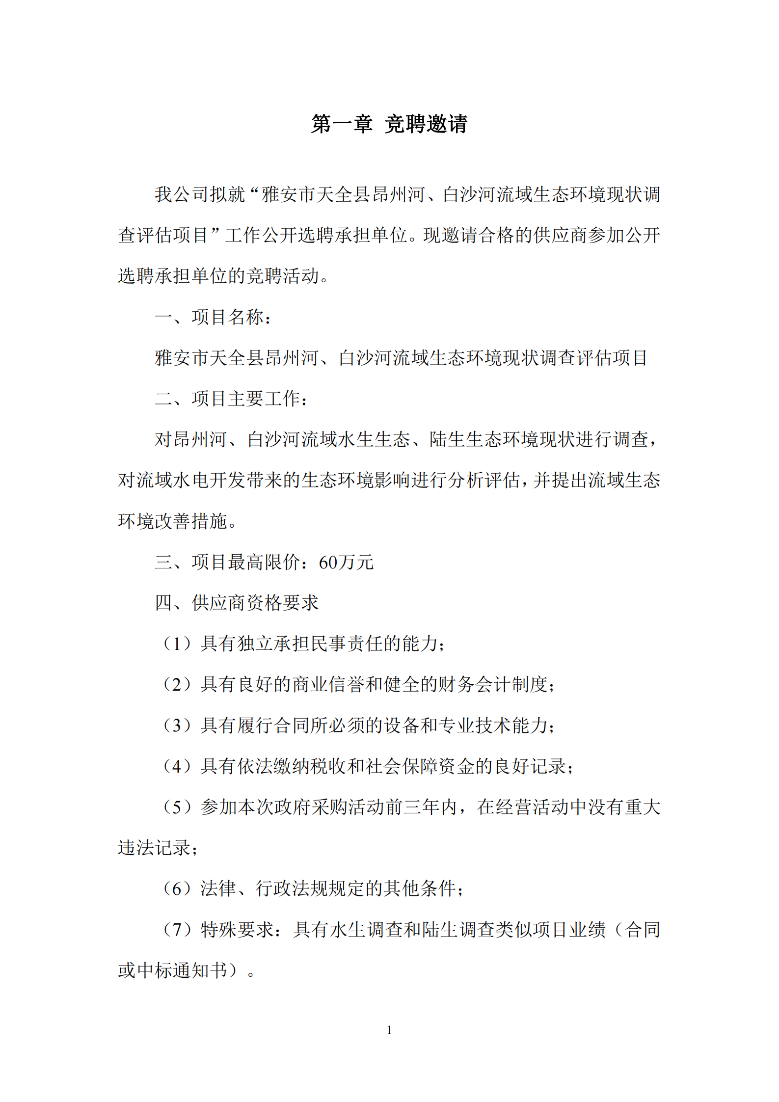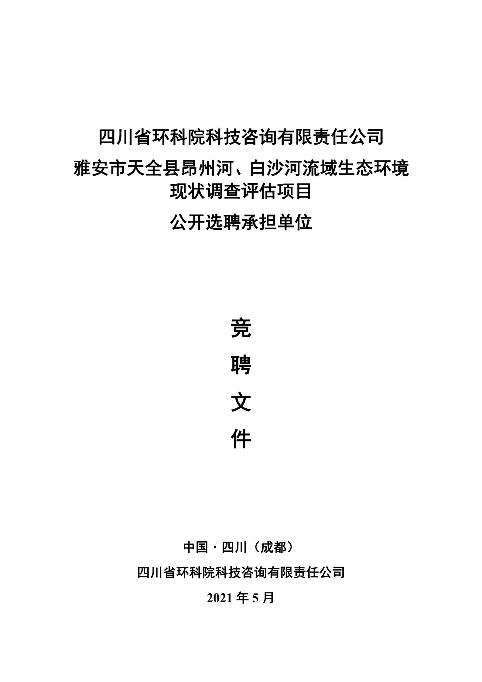 我公司擬就“雅安市天全縣昂州河、白沙河流域生態(tài)環(huán)境現(xiàn)狀調查評估項目”工作公開選聘承擔單位。現(xiàn)邀請合格的供應商參加公開選聘承擔單位的競聘活動,選聘文件如下: