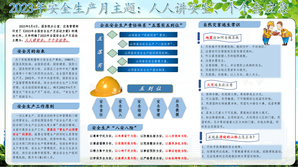 公司組織開展2023年安全生產(chǎn)月培訓(xùn)、消防安全知識宣講及地震應(yīng)急演練活動,組織員工參與全國“安康杯”知識競賽活動,通過層層傳導(dǎo)安全責(zé)任,要求各部門牢固樹立安全生產(chǎn)責(zé)任意識,做到人人目標(biāo)明確、責(zé)任到位,為開展“安全生產(chǎn)月”工作打好基礎(chǔ)。