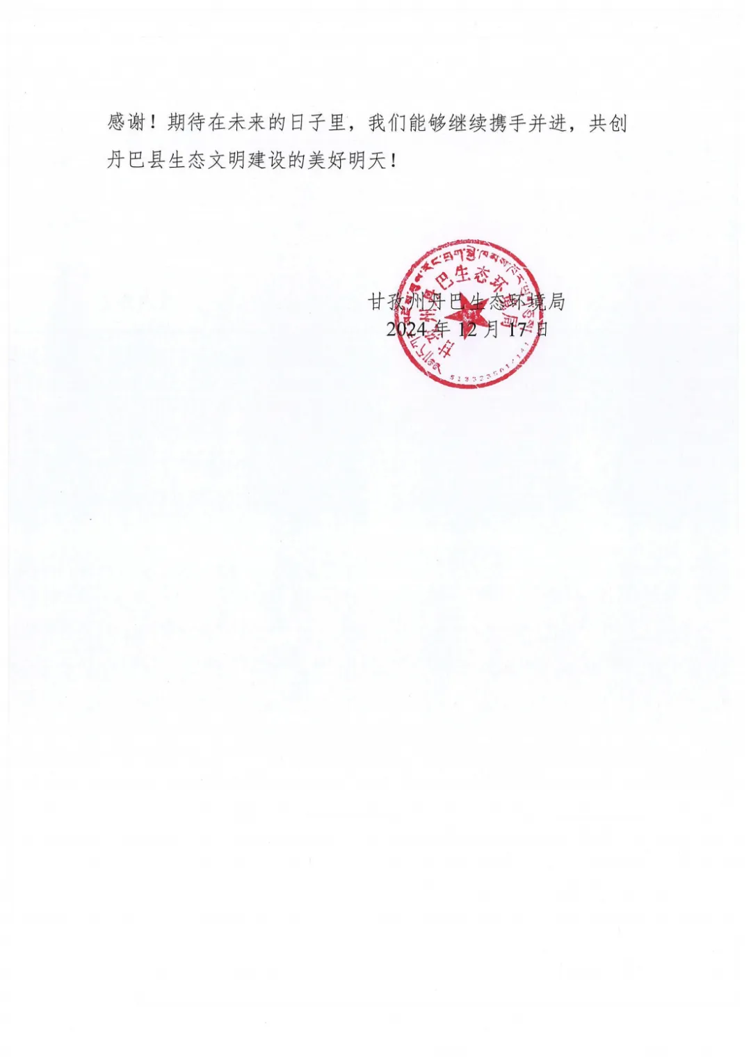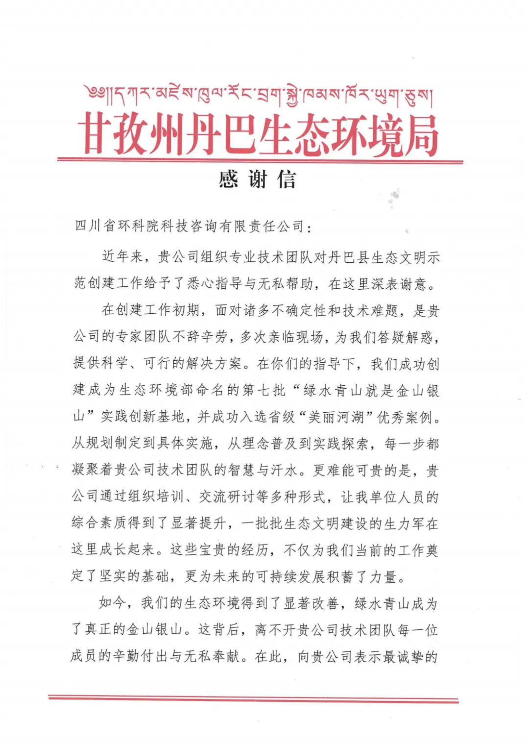 正是因為技術(shù)團隊的艱辛付出,才取得這些優(yōu)異的工作成果,也得到了地方部門的高度認(rèn)可。甘孜州丹巴生態(tài)環(huán)境局特發(fā)來感謝信,向我司表示誠摯的感謝,這封感謝信不僅是對我司技術(shù)實力的肯定,更是對團隊敬業(yè)精神的高度贊譽。
